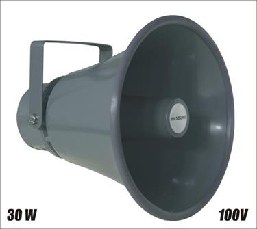 Megafon radiowęzłowy 100V o mocy do 30W RMS, przeznaczony do nagłaśniania zwenętrznych powierzchni w obiekatch użyteczności publicznej, handlowych, sportowych, sakralnych itp, Wbudowany transformator. Obudowa driver'a z wysokiej jakości tworzywa ABS. Tuba wykonana z aluminium. Metalowy masywny uchwyt. Wodoodporny - klasa szczelności IP66. Dane techniczne: